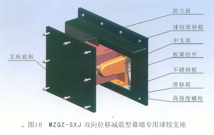 支座的橫軸向位移均是在球鉸滑移箱內(nèi)實(shí)現(xiàn),可大大減小與主體結(jié)構(gòu)的配合尺寸;2、軸承內(nèi)圈與銷軸之間采用過(guò)盈配合,銷軸與軸承內(nèi)圈相對(duì)同定,通過(guò)滑移箱與中支架之間的不銹鋼板和聚四氟乙烯滑板的相對(duì)滑動(dòng)來(lái)實(shí)現(xiàn)位移,中支架與滑移箱側(cè)壁向根據(jù)位移量的不同設(shè)有板簧或橢網(wǎng)形板簧,板簧在位移過(guò)程中的形變起到減震阻尼的作用。銷軸水平徑向的位移是通過(guò)軸承外圈所套方形軸承座與箱體間的不銹鋼板和四氟滑板的相對(duì)滑動(dòng)實(shí)現(xiàn)。