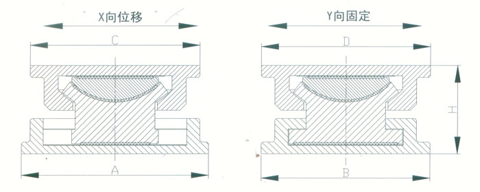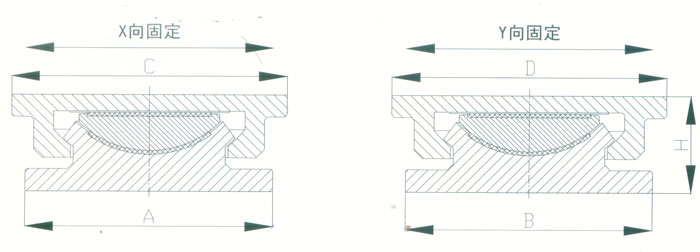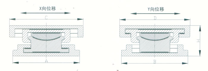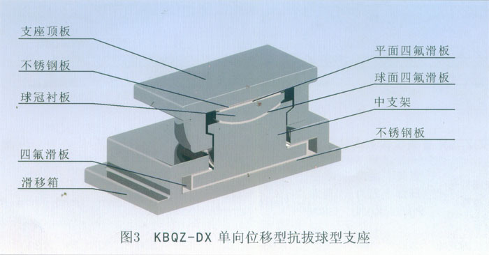 4 KBQZ系列抗拔球型支座 本系列支座主要分為抗拔球型支座和減震抗拔球型支座,下面對其進行分類介紹。4.1抗拔球型支座 此類支座分為固定型、單向位移型和雙向位移型,支座結構如圖3。其主要由支座頂板、不銹鋼板、平面聚四氟乙烯滑板、球冠襯板、球面聚四氟乙烯滑板、中支架、聚四氟乙烯滑板、不銹鋼板和滑移箱組成。支座中的相對滑移部件之間,采用目前世界上摩擦系數(shù)最低的聚四氟乙烯滑板和不銹鋼板相隔,充分減小了摩擦阻力,使各部分之間的運動流暢,避免爬行現(xiàn)象的產(chǎn)生。本類支座通過球面聚四氟乙烯滑板上部構件沿著球面相對于下部構件的轉(zhuǎn)動實現(xiàn)轉(zhuǎn)角(常用值為0.02rad),在工作過程中支座沿著滑移箱滑道滑動實現(xiàn)水平位移。 豎向壓力的傳遞是通過支座頂板,不銹鋼板,平面聚四氟乙烯滑板,球冠襯板,球面聚四氟乙烯滑板,中支架,聚四氟乙烯滑板,不銹鋼板依次疊加傳至滑移箱底板。 豎向拔力的傳遞是通過支座頂板和中支架的抗拔接觸面將作用于支座頂板上的上.拔力傳至中支架,再由中支架與滑移箱之間的抗拔四氟滑板和不銹鋼板將力傳至滑移箱頂板。 水平力的傳遞是通過支座頂板側(cè)壁與中支架側(cè)壁之間.的接觸面將水平力傳至中支架,再由中支架與滑移箱的接觸面?zhèn)髦粱葡鋫?cè)壁根部。 固定型抗拔球型支座不設滑移箱。4.1.1普通抗拔雙向位移型球型支座KBQZ-SX普通抗拔雙向位移型球型支座參數(shù)表 表74.1.2普通抗拔單向位移型球型支座KBQZ-DX普通抗拔單向位移型球型支座參數(shù)表 表84.1.3普通抗拔固定型球型支座KBQZ-GD普通抗拔固定型球型支座選用參數(shù)表 表9