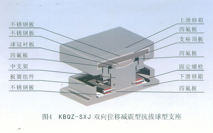 支座頂板、不銹鋼板、聚四氟乙烯滑板、球冠襯板、中支架、板簧組件和防塵板組成。
